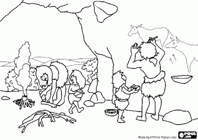 3. colorea y pega en tu cuaderno la imagen sobre la vida en las cuevas. Observa y nombra las cosas quehace esta familia de cavernícolas.